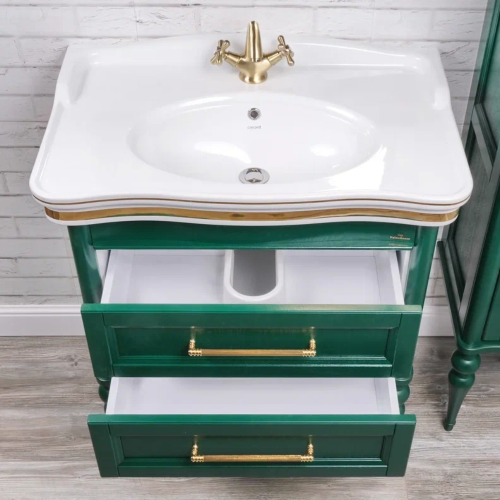 Тумба напольная ValenHouse коллекция Эстетика 80 с 2 ящиками, в цвете зеленый, ручки на выбор - бронза, золото, хром. Материал корпуса и фасада - массив ясеня. Лакокрасочные материалы (Irurena, Испания) имеют стойкость к ультрафиолету и придают изделию повышенную защиту от влаги. Производство мебели — Россия. Производство и поставка осуществляется в 3 цветах — белый, синий, зеленый и с ручками на выбор - бронза, золото, хром.